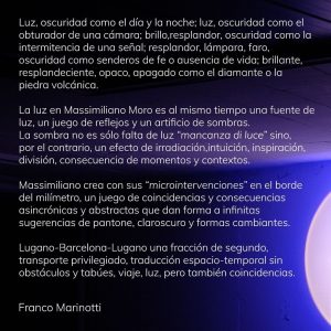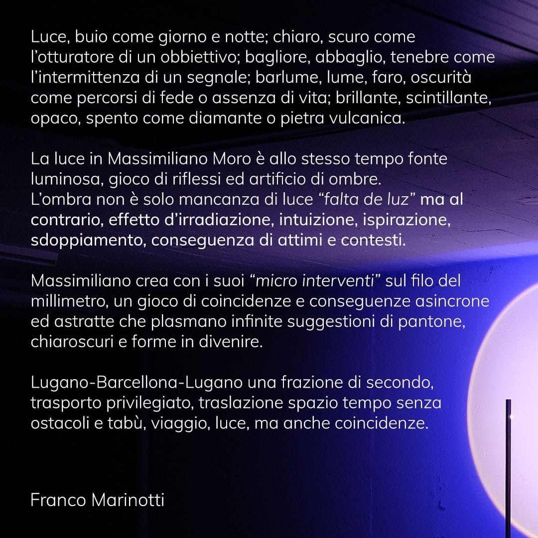 La luce in Massimiliano Moro è allo stesso tempo fonte luminosa, gioco di riflessi ed artificio di ombre.